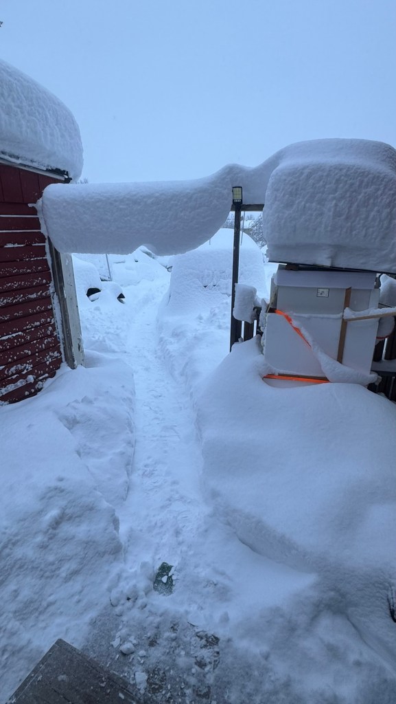 De senaste veckorna har det mesta kretsat runt snön. Vi hade en grön jul, sedan kom stormen Johannes och sopade ner en massa träd och ställde till med oreda. Och ett par dagar senare kom snön som nu ligger meterdjup. Vissa dagar snöade det på friskt, kom flera decimeter på ett par timmar. Min Håkan har haft heltidsjobb med att skotta, slunga och ploga. Jag har känt mig väldigt frustrerad över att inte kunna vara ute och hjälpa till… men jag kanske bara varit ivägen. 😅