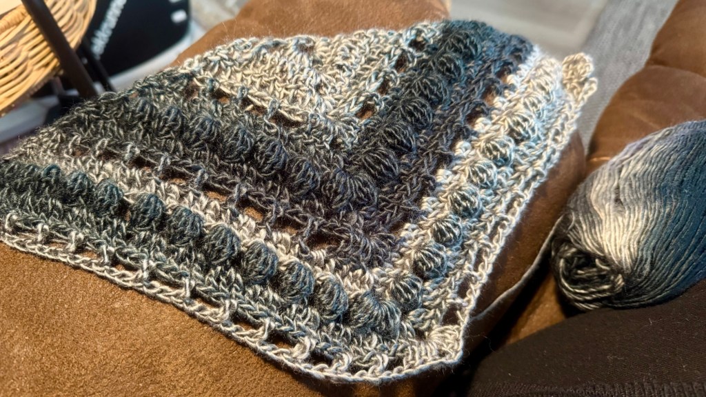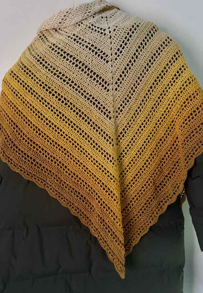 Den gula sjalen har jag virkat i bomullsgarn. Den andra har jag precis börjat med och där har jag ett akrylgarn. Problemet är att jag inte kan använda garn som ”dammar”. Yllegarn är uteslutet och akrylgarnet är på gränsen. Jag tål inte att få en massa partiklar i näsan… blir snorig och får en riktig näsbränna. 🤣🤣