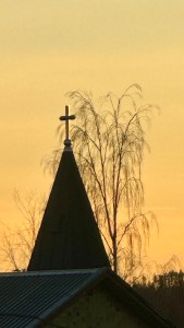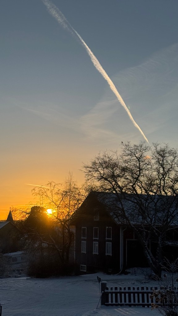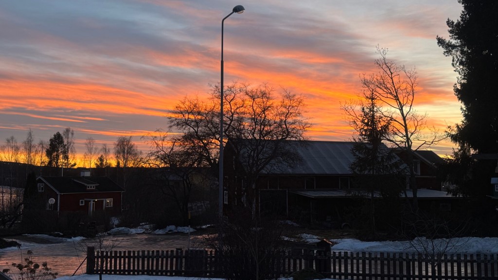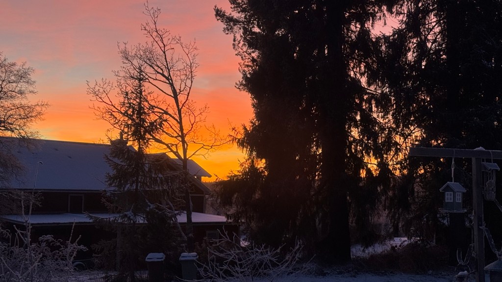 Nu har vi i alla fall litet vitt på marken och ganska kallt. I skrivande stund har vi en fantastisk solnedgång över hustaken.