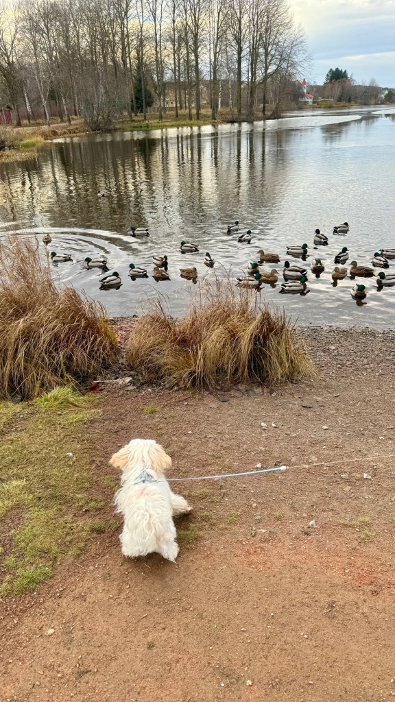 Tog en tur runt sjön Vågen i Bollnäs och Marvin gillade alla fåglar som han försökte jaga. Som tur är har de vingar.