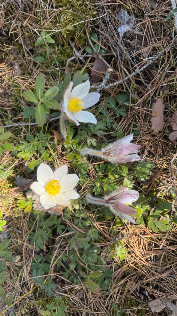 Lyckades vara på plats när mosippan blommade. Det är ju så kort tid, snart står där bara några dunbollar kvar. Vitsipporna har också börjat slå ut. De här växer vid banvallen bara en bit från oss. En släkting till mosippan är backsippan och den har vi i rabatten. Den har knoppar och slår snart ut med blålila blommor.