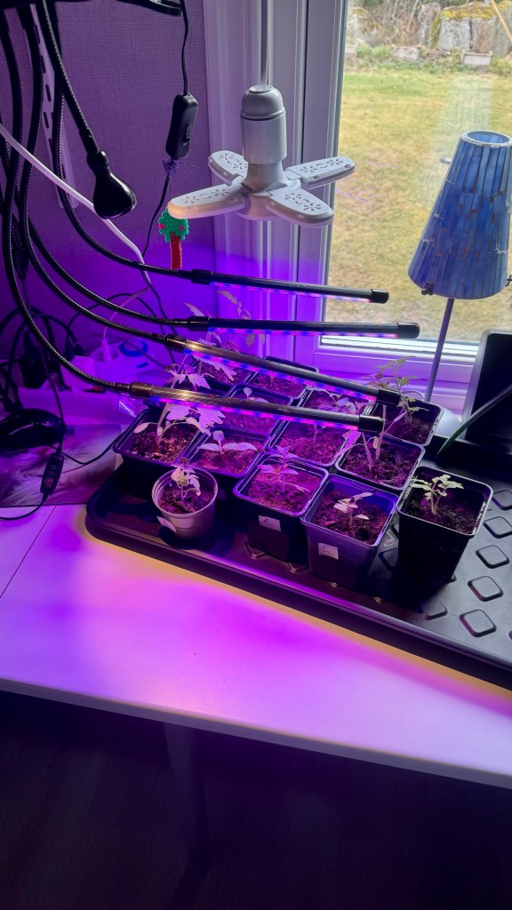 Våren kom tidigt i år och just nu så är det full fart på odlingarna här inne. Varje ljus plats utnyttjas. Så här kan det se ut.